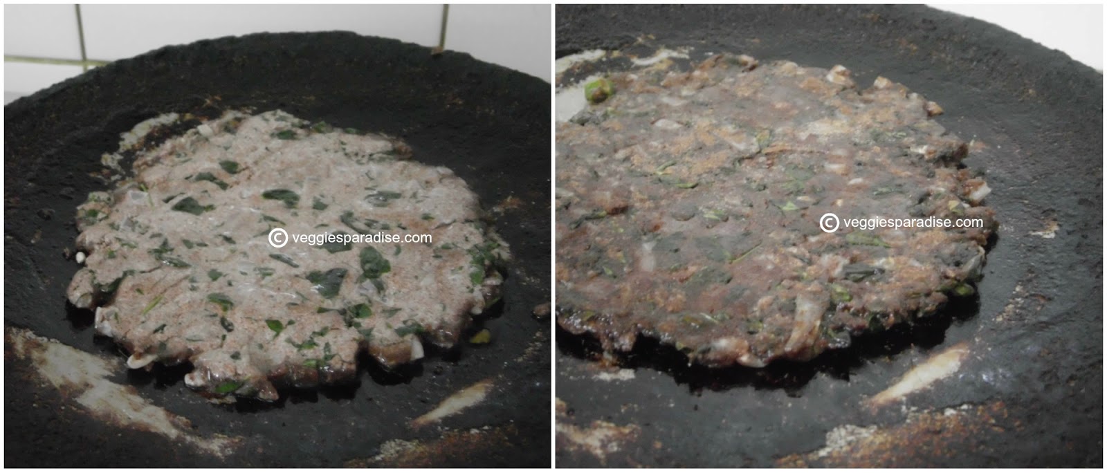 Place the ball directly on the tawa and flatten it up.( Alternatively you can smear little oil on a plastic sheet , flatten the ball in a circular shape and place it gently on the tawa.)